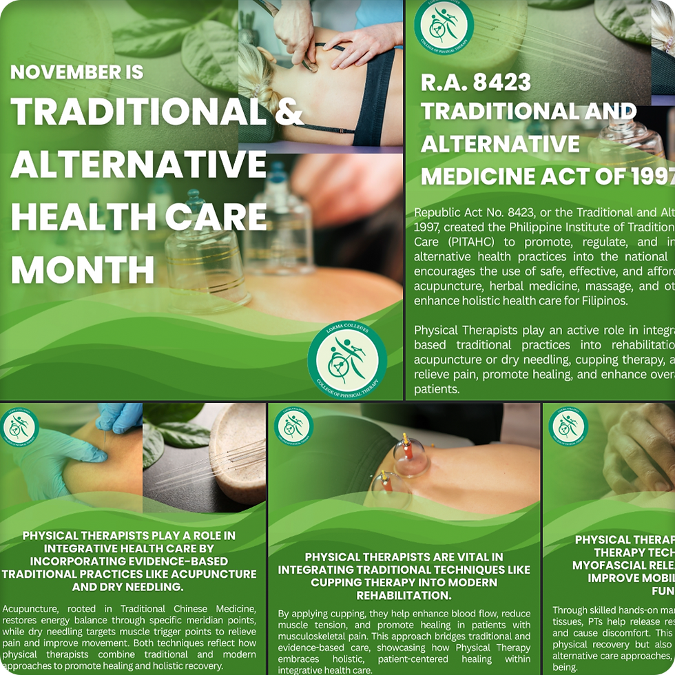 In observance of November's Traditional and Alternative Health Care Month in the Philippines, Lorma Colleges’ College of Physical Therapy highlights the crucial role of Physical Therapists in promoting holistic and accessible health care. Aligning with the goals of the Philippine Institute of Traditional and Alternative Health Care (PITAHC), Physical Therapists advance these principles through non-invasive, evidence-based, and restorative care that complements traditional and alternative practices, ultimately empowering individuals to achieve wellness by utilizing natural and therapeutic means to promote movement, manage pain, and restore the body's innate capacity for functional recovery and balance.