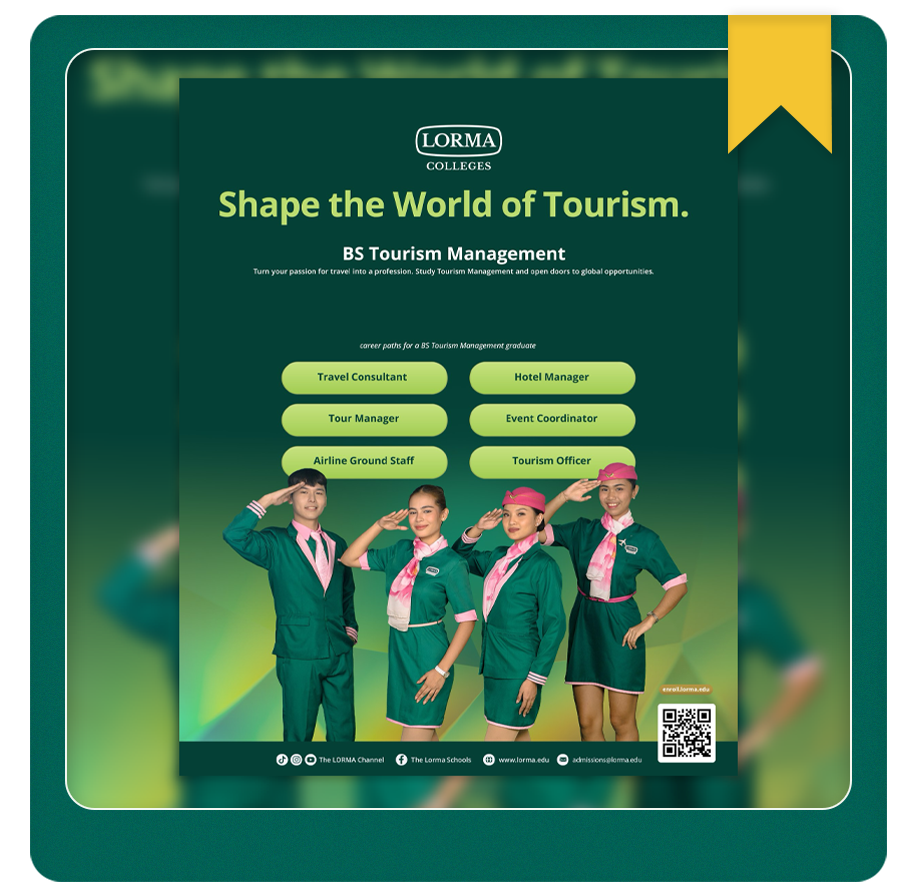 Turn your passion for travel into a meaningful career with the Tourism Management program at Lorma Colleges, where you discover new cultures, create unforgettable experiences, and develop the skills to lead in the global tourism industry while building a strong foundation for your future. Start your journey today—explore, connect, and thrive with Lorma Colleges. Visit us at our Carlatan & San Juan Campus.